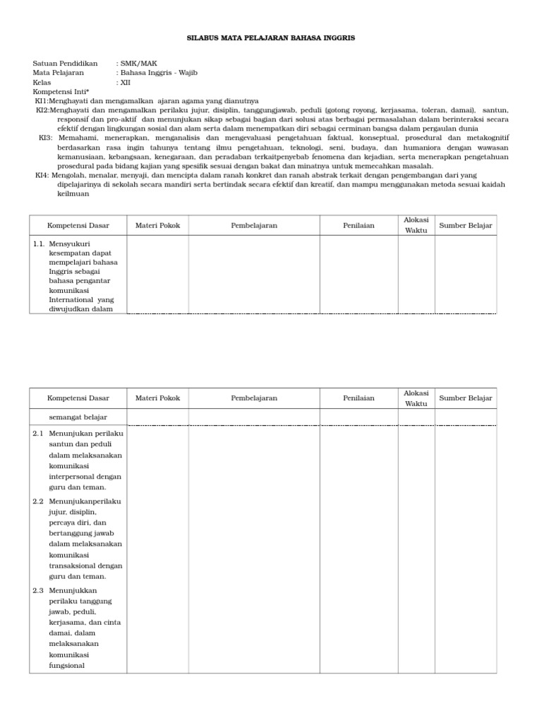Silabus Bahasa Inggris Smk Kelas X Kurikulum 2013 Pdf from imgv2-2-f.scribdassets.com We did not find results for: Check spelling or type a new query. Maybe you would like to learn more about one of these?